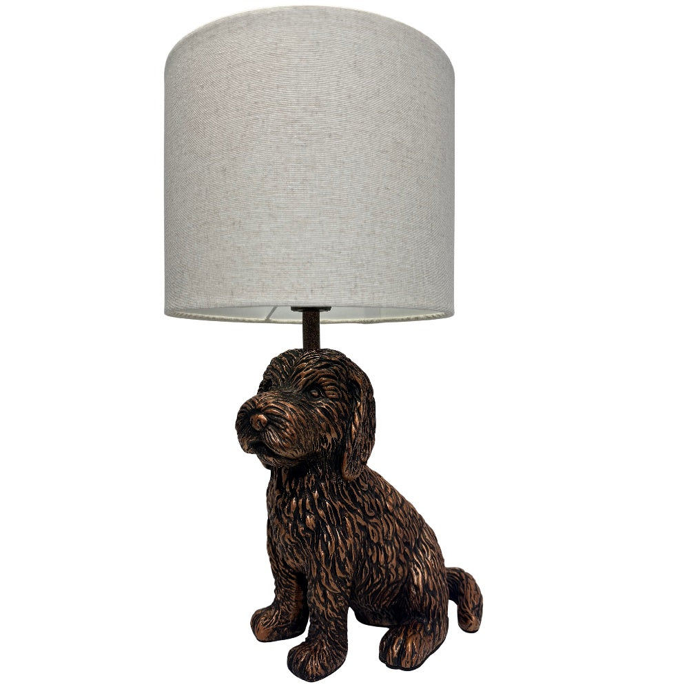Antique Copper Sitting Puppy Table Lamp with Natural Linen Drum Shade 42cm