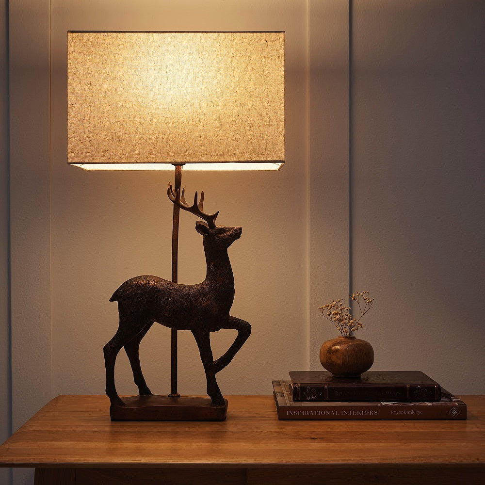 Antique Copper Stag Table Lamp with Natural Linen Rectangular Shade 61cm
