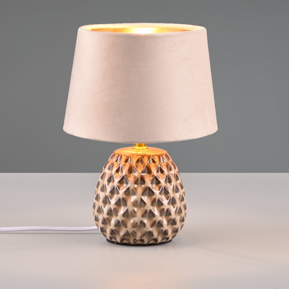 Britalia BR51531044 Beige and Cream Ceramic Pine Cone Table Lamp with Beige Velvet Shade - 27cm Height  A stunning vintage retro ceramic pine cone effect base sculpture indoor table lamp desk light finished in beige with a cream velvet tapered drum lampshade with gold inner. Manufactured from high grade ceramic...