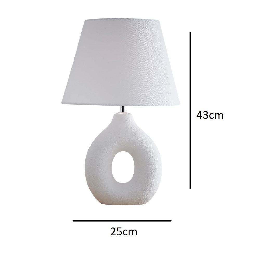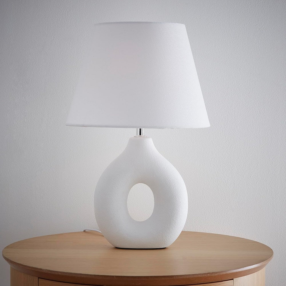 This modern ceramic table lamp is effortlessly elegant and brings a calming presence to any interior. Featuring a sculptural white ceramic base with a smooth matte finish and distinctive oval cut-out, this lamp combines contemporary design with timeless appeal. Topped with a classic white fabric tapered shade off the chrome stem, it casts a soft, ambient glow, perfect for bedrooms, living rooms, or minimalist office spaces.