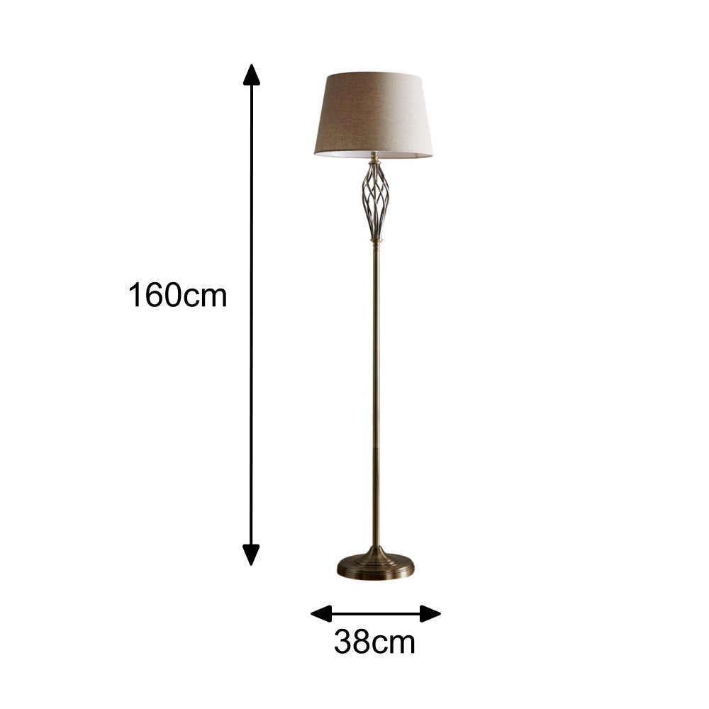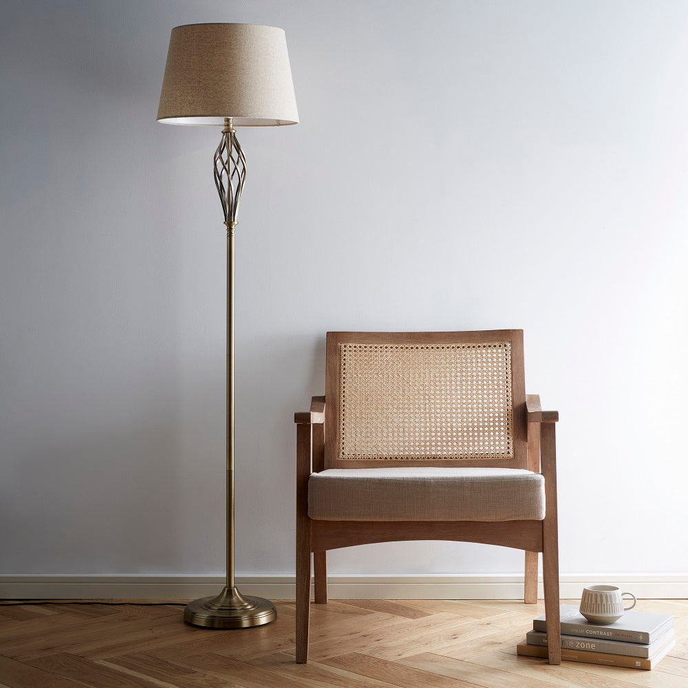 Britalia BRLCOMPTONAB/FLWS Antique Brass Barley Twist Vintage Floor Lamp with Oatmeal Natural Linen Tapered Drum Shade - 160cm Height  A stunning vintage style floor lamp with an antique brass barley twist stem & oatmeal natural linen shade. A mix of traditional & vintage retro designs creating an eye catching floor...
