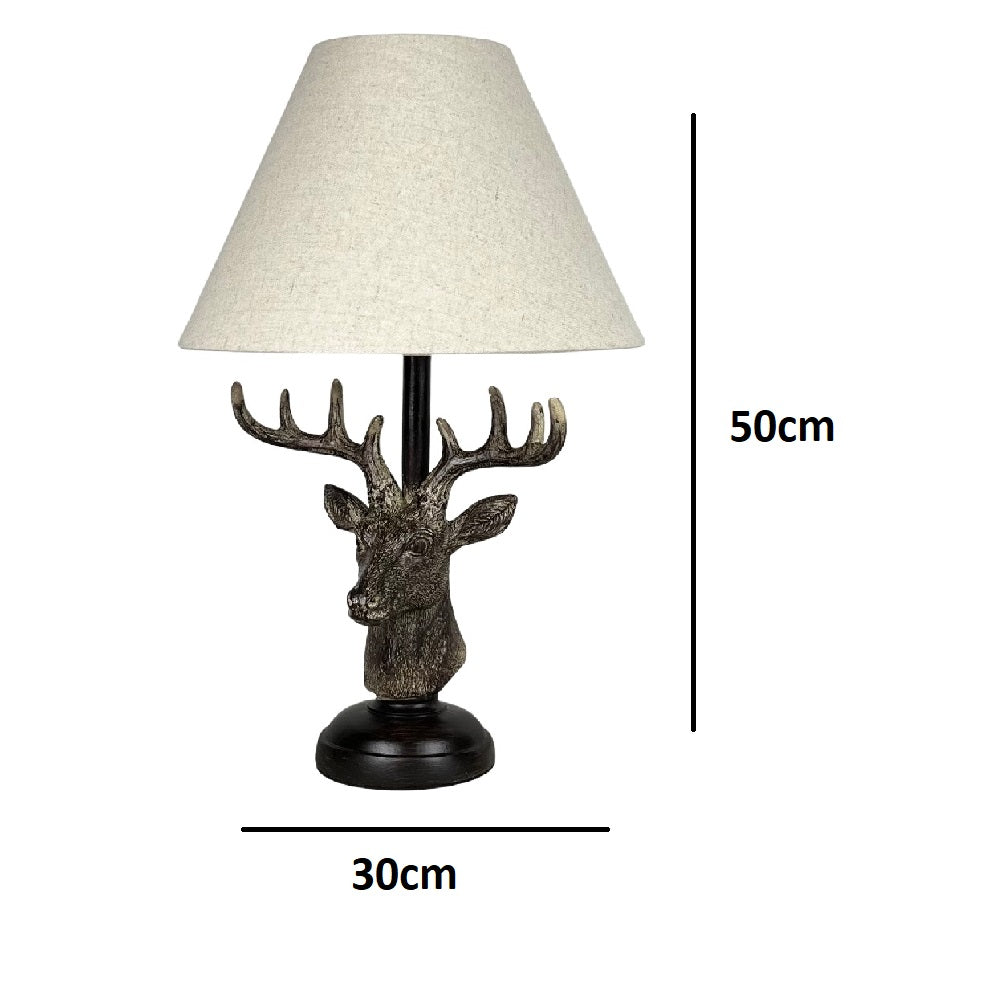 A stunning vintage brown rustic high definition stag head table lamp with linen tapered drum lampshade. A classic retro design that is perfect for shabby chic, rustic and cottage design tastes. Can be used as a single lamp light or paired to balance the room. A unique table desk lamp design that creates a visual eye catching centre piece for any room. The high definition stag head supports the quality shade.