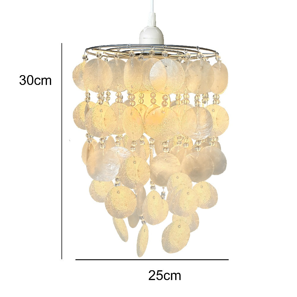Add a touch of coastal charm and natural elegance to your space with this handcrafted Capiz Shell Non-Electric Pendant. Featuring delicate, translucent and pearl Capiz shell discs suspended in cascading tiers, this shade diffuses light beautifully, creating a soft, ambient glow and a relaxing atmosphere. The crystal acrylic beads adds that touch of sparkle and when lit helps this non electric pendant shine. This bohemian style pendant easily attaches to standard ceiling pendant fittings so there is no electrician required.